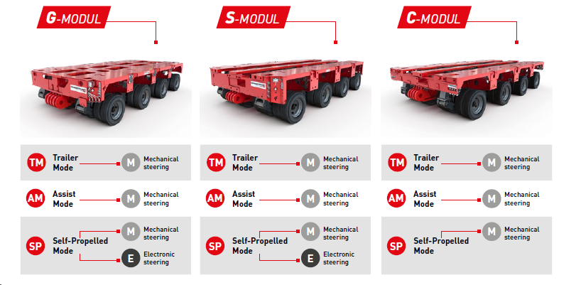 The trailer mode is the most common way to work with modular platform trailers in on-road and off-road applications. One or more trucks pull or push the trailer by means of a drawbar system or a gooseneck.